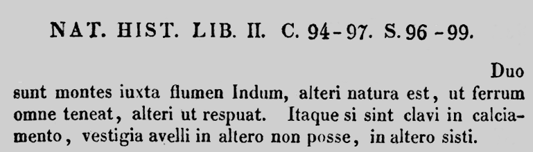 Descripción del magnetismo de Plinio el Viejo: "Había dos Montañas cerca del Rio Indo: La Naturaleza de una es sujetar firmemente toda Forma de Hierro y de la otra rechazarlo: y, por lo tanto, si la Suela de los Zapatos del Hombre estuviese fijada con Clavos, en una de las montañas el Hombre no podría desprender su Pie, y en la otra no podría posarlo" (Historia Natural — Naturalis Historia; lib. II, chap. XCVI).