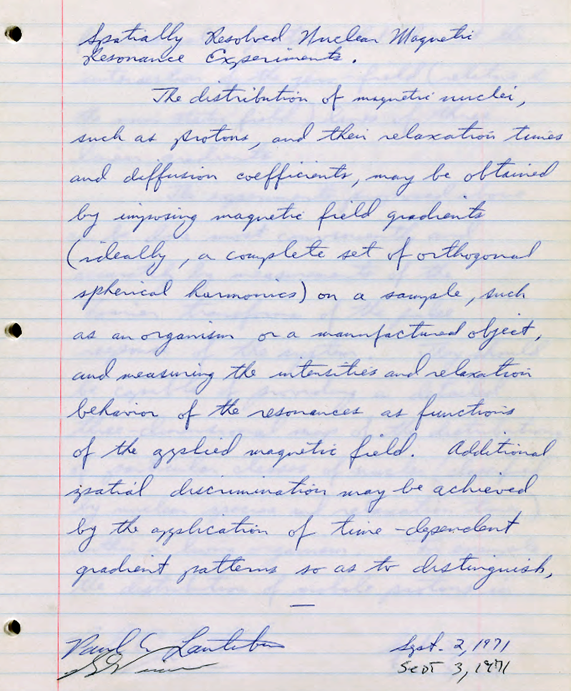 Primera página del cuaderno de laboratorio de Lauterbur en la que describe su idea de "Solución espacial para experimentos de resonancia magnética nuclear", firmado y certificado por testigos el 3 de septiembre de 1971.